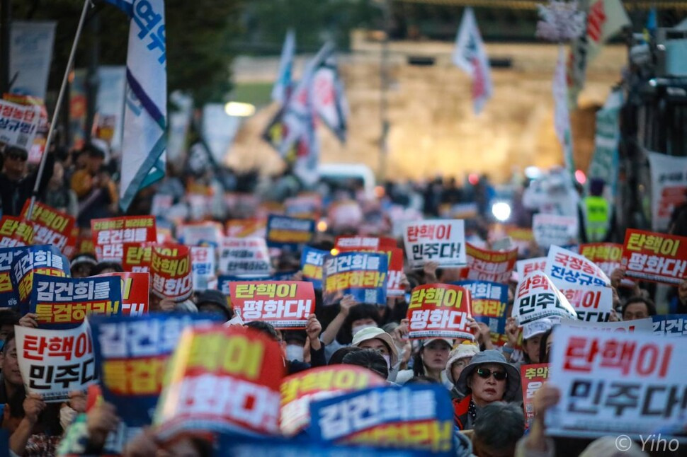 젊은 층 참여도 눈에 띄었다. 서울 서초구에서 온 홍가영(30)씨는 “국민이 뽑은 건 윤 대통령인데 부인이 모든 이권에 연결돼 있다는 게 말이 안 된다”며 “모든 권력기관이 윤 대통령과 김 여사를 감싸는 것도 부당하다고 생각한다”고 지적했다. 약속이 있어 나왔다가 집회에 참여하게 됐다는 박아무개(24)씨도 “대통령이 법을 자신과 부인에게 유리한 쪽으로 이용하는 것 같아 평소 불만스러웠는데 마침 집회가 열려 친구와 참여하게 됐다”고 밝혔다.