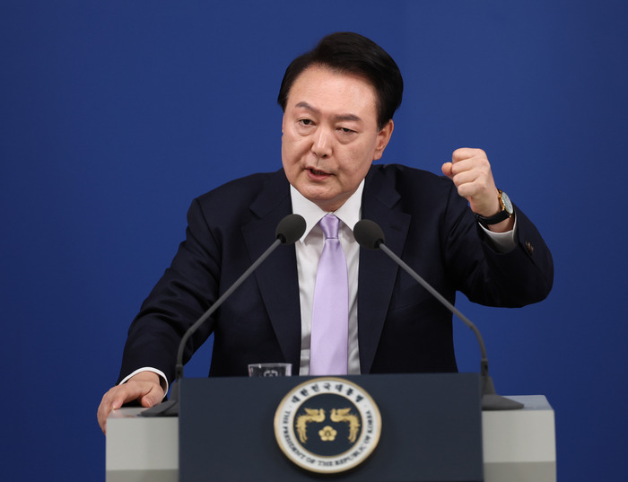 윤석열 대통령이 지난 7일 오전 서울 용산 대통령실 청사 브리핑실에서 열린 ‘대국민담화 및 기자회견’서 질문에 답변하고 있다. 연합