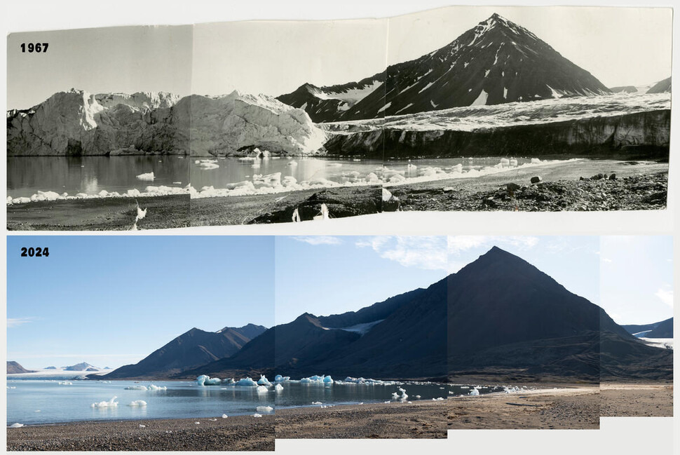 국제환경단체 ‘그린피스’는 지난 6일(현지시각) 북극해에 위치한 노르웨이령 스발바르제도 빙하 지역의 현재와 과거를 비교한 사진들을 내놨다. 단체는 지난 2002년부터 유명 사진작가 크리스티안 오슬룬드와 협업해 북극 빙하가 감소하는 모습을 기록해왔다. 이번에 공개된 사진은 노르웨이 극지연구소 아카이브에 보관되어 있는 빙하 사진과 같은 지역의 현재 모습을 오슬룬드가 촬영한 것이다.