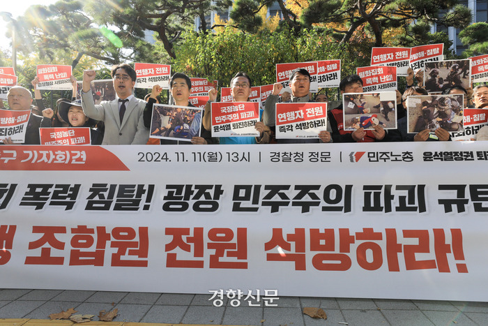 민주노총 조합원들이 11일 서울 서대문구 경찰청 앞에서 1차 윤석열 정권 퇴진 총궐기 집회에 참가했다 경찰에 연행당한 조합원 10여명을 석방하라는 내용의 기자회견을 열고 있다. 이준헌 기자