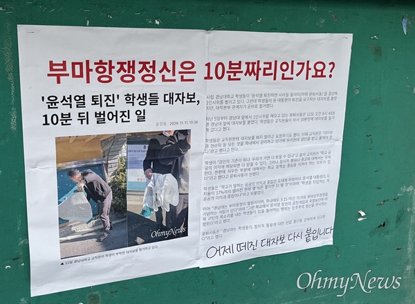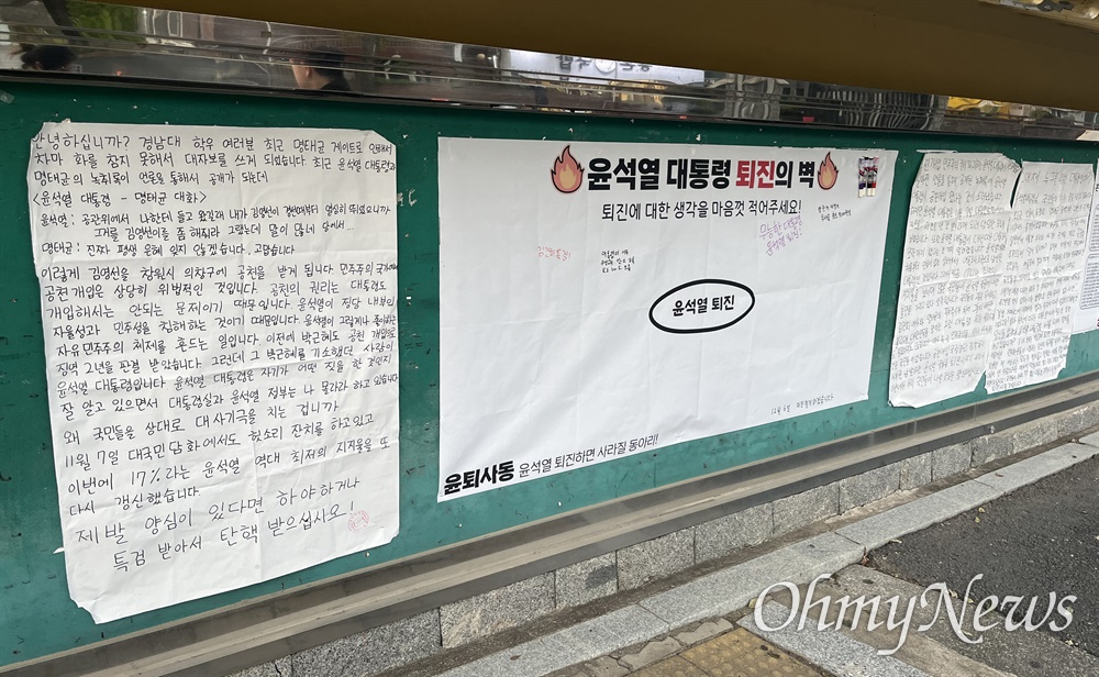 경남 창원마산 소재 사립 경남대학교 학생들이 윤석열 대통령 퇴진을 요구하는 대자보를 또다시 붙였다.