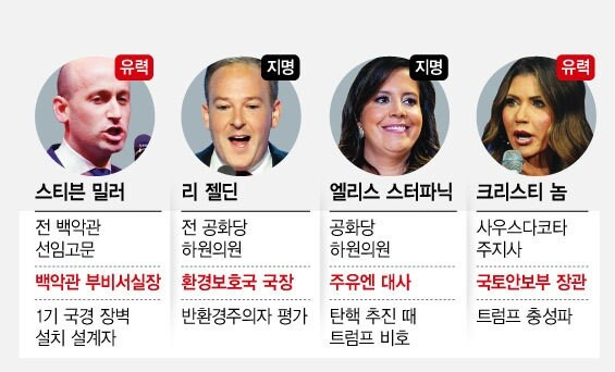 시엔엔은 12일 국토안보부 장관으로 충성파인 크리스티 놈 사우스다코타 주지사를 낙점했다고 보도했다. 그는 세관국경보호국, 이민세관집행국, 연방재난관리청, 비밀경호국 등을 감독하는 방대한 기관을 총괄하는 임무를 맡게 될 것으로 보인다. 트럼프는 앞서 톰 호먼 전 이민세관단속국 국장 직무대행을 ‘국경 차르’로 임명하겠다고 트루스소셜에 밝혔다. 미등록 이민자 대량 추방 공약의 실천 의지와 함께 강경파, 충성파를 기용하는 인사 기조가 뚜렷해지고 있다.