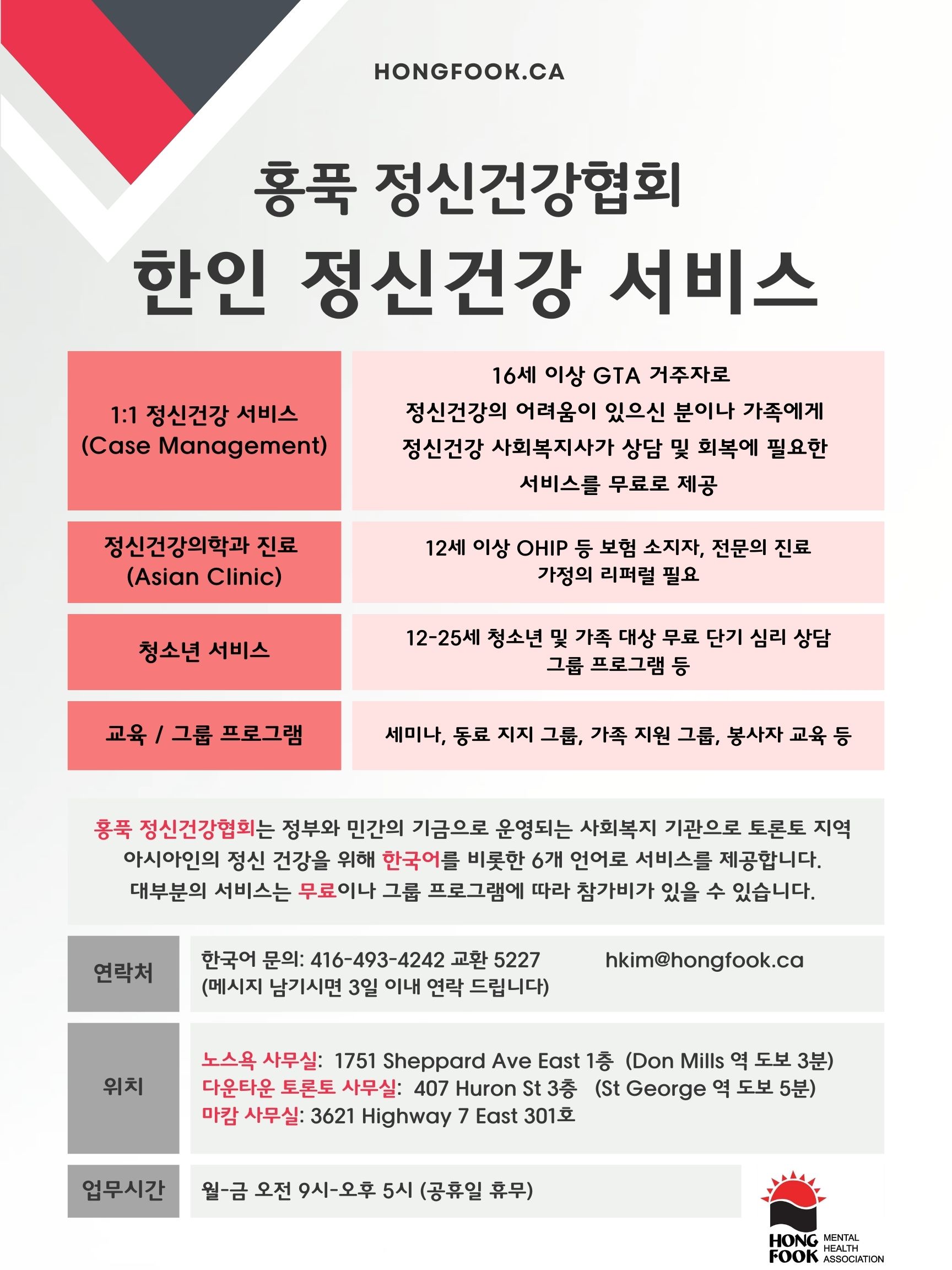 홍푹정신건강협회는 정부와 민간 기금으로 운영되는 사회복지 기관으로, 토론토와 한인 커뮤니티를 포함한 아시아인의 정신 건강을 지원하는 다양한 프로그램을 한국어 등 6개 언어로 대부분 무료 제공해 경제적 부담없이 정신건강을 돌볼 수 있게 지원하고 있다.