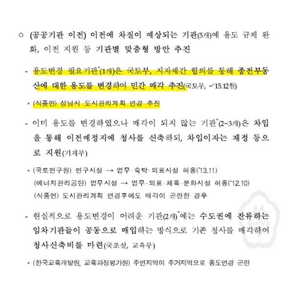 박 전 대통령이 직접 주재한 회의에 '국토부를 통해 성남시 식품연구원 도시관리계획 변경을 추진한다'는 보고 문건이 올라간 사실도 확인됐다. 2014년 3월 12일 청와대에서 대통령 주재 지역발전연석회의가 열렸는데, 이날 관계부처 합동으로 박 전 대통령에게 올려진 보고문건(지역주도 맞춤형 지역경제 활성화 대책)을 보면, 여러 공공기관 지방 이전 문제 중 성남시 분당구 백현동 소재 식품연구원 한 곳만 콕 집어 "용도변경 필요기관"이라고 적은 뒤 "국토부-지자체간 협의를 통해 종전 부동산(공공기관 지방 이전 뒤 수도권에 남은 이전 공공기관의 부지)에 대한 용도를 변경해 민간 매각 추진한다. 식품연구원의 경우 성남시 도시관리 계획 변경을 추진한다"고 한 사실이 확인된다.