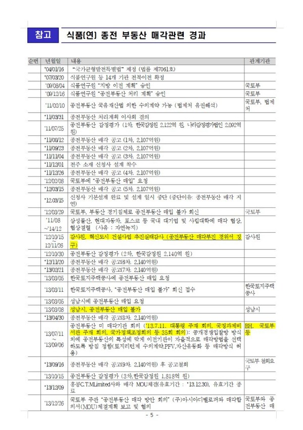 이 외에도 <워치독>이 입수한 식품연구원이 2021년 10월 작성한 '종전 부동산 매각관련 경과' 문건을 보면, 중앙부처 중심으로 백현동 식품연구원 부지 매각 관련 회의가 수십 차례 열린 사실도 확인된다. 박 전 대통령의 이른바 "사생결단" 발언 직전인 2014년 2월 28일 오전 청와대 국정과제비서관 주재로 '지방이전 지연기관 대책회의'가 열렸고, 2014년 2월 21일 국토부에서도 관련 건으로 관계부처 합동회의가 열렸다. 2013년 12월 26~27일 국토부 주관으로 '종전 부동산 매각 방안 회의' '미착공 예상기관 대책회의' 등이 연달아 열렸고, 2013년 7월 11일~9월 6일 사이 '(성남시 식품연구원을 포함한) 종전 부동산 매각 관련' 건으로 대통령과 청와대 국정과제비서관 등이 주재한 정부부처 회의만 총 35회 열리기도 했다