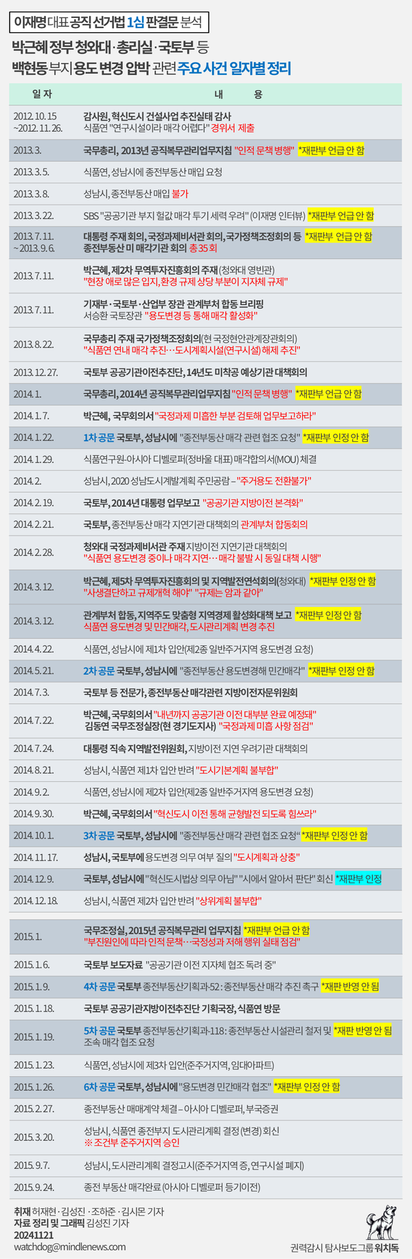 앞서 <워치독>은 오전 「"협조 안하면 문책" 이재명 압박 총리실 문건 확인」이라는 제하의 단독 보도를 통해 박근혜 정부 청와대와 총리실, 국토교통부가 백현동 식품연구원 부지의 용도변경을 위해 수십 차례 회의를 갖고 전방위적으로 성남시를 압박한 문건들을 공개했다. 또 식품연구원 부지 용도변경과 관련해 "국토부로부터 직무유기를 문제삼겠다는 압박을 받았다"는 이 대표의 국정감사장 발언 배경을 입증하는 박근혜 정부 총리실의 '공직복무관리업무지침' 문건도 밝혀냈다. 해당 문건에는 이 대표가 결심 공판에서 말한 '인적 문책'의 내용이 담겨 있었다.