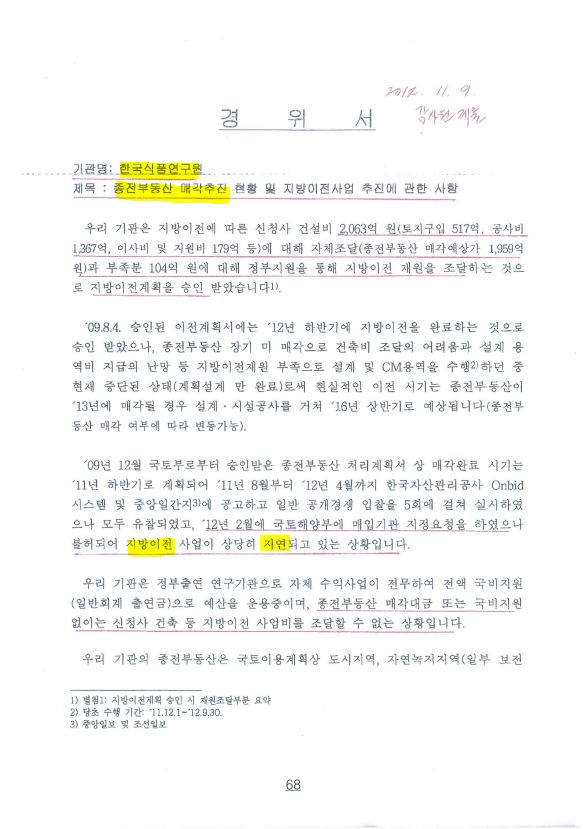 성남시 식품연구원 부지 매각 압박에는 감사원까지 동원된 정황이 있다. <워치독>이 입수한 감사원의 '2013년 3월 혁신도시 건설사업 추진실태 감사 결과 보고서'를 보면, 감사원은 지방 이전이 지연된 9개 기관 중 식품연구원을 콕 집어, "종전 부동산 이외에는 이전 재원이 없어 지방 이전이 불가피한 것으로 검토됐다"고 밝혔다.