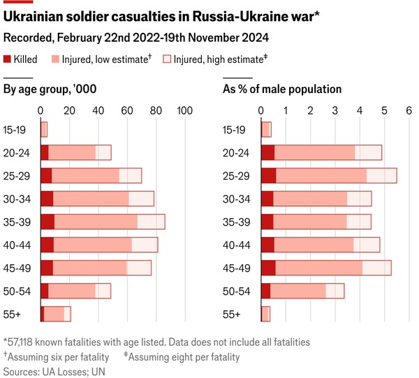 우크라이나와 러시아 모두 인구 대비 전투 중 사망자 수는 베트남전쟁과 한국전쟁에서 숨진 미군 사망자 수를 합친 것보다 더 많다. 그것은 제2차 세계대전에서 미국이 입은 인명손실에 빠른 속도로 접근하고 있다. 우크라이나 침공 이후 러시아가 입은 인명손실은 모병한 외국인 전투원 사망자를 빼고도, 1945년 이후 이 나라가 치른 모든 전쟁들에서 발생한 사상자 수를 합친 것보다 훨씬 더 많다.