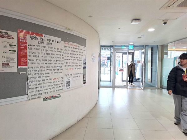 <오마이뉴스> 취재를 종합하면 지난 17일 오후 서울 관악구 서울대 학생회관, 중앙도서관, 행정관, 공과대학 총 네 곳의 게시판에 '국민의 적 윤석열을 타도하자'라는 제목의 대자보가 붙었다.