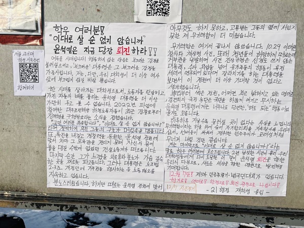 학생들이 붙인 대자보 말미에는 대부분 '12월 7일 윤석열 정권퇴진 범국민대회에 함께 나가자'는 호소가 담겨 있다. 더 이상 참지 못하는 대학생들이 12월 7일 광장으로 나와 다시 촛불을 들지 주목된다.