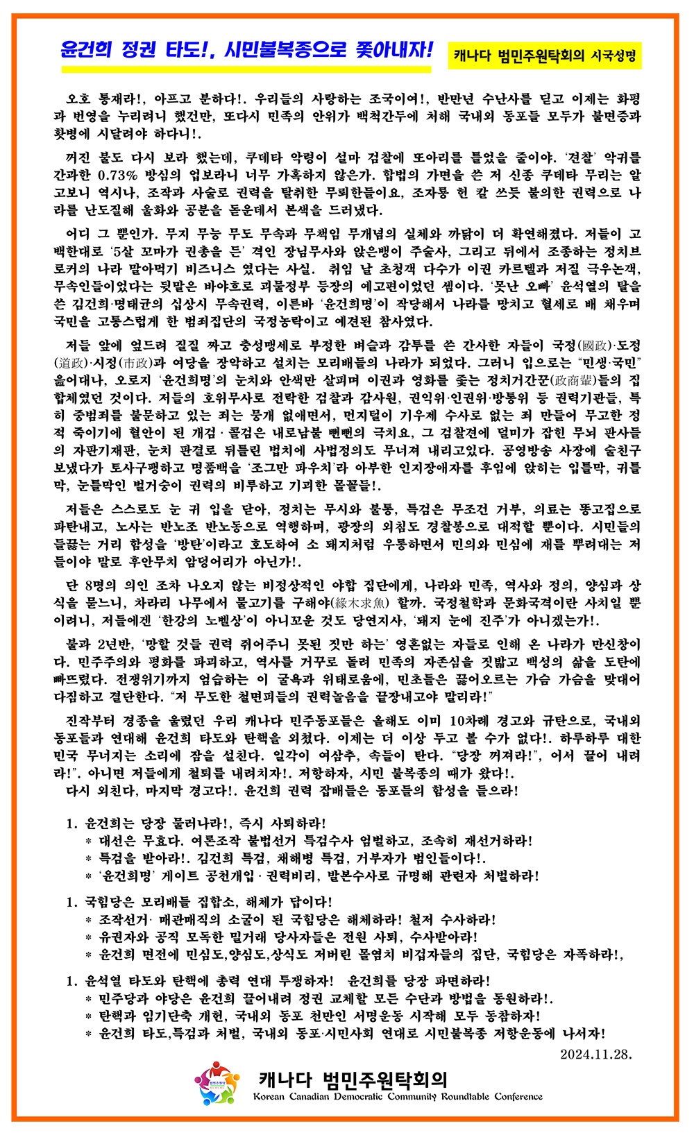 성명은 “영혼없는 자들로 인해 온 나라가 만신창이다.…이 굴욕과 위태로움에 민초들은 끓어오르는 가슴 가슴을 맞대어 다짐하고 결단한다.‘저 무도한 철면피들의 권력놀음을 끝장내고야 말리라!’”라는 단호한 결의를 밝혔다. 이어 “진작부터 경종을 울렸던 우리 캐나다 민주동포들은 올해도 이미 10차례 경고와 규탄으로, 국내외 동포들과 연대해 윤건희 타도와 탄핵을 외쳤다. 이제는 더 이상 두고 볼 수가 없다!. 하루하루 대한민국 무너지는 소리에 잠을 설친다. 일각이 여삼추, 속들이 탄다. “당장 꺼져라!”, 어서 끌어 내려라!”. 아니면 저들에게 철퇴를 내려치자!. 저항하자, 시민 불복종의 때가 왔다!.”고 국내외 동포들의 궐기를 제창하며 3개항의 요구사항을 강력 촉구했다.