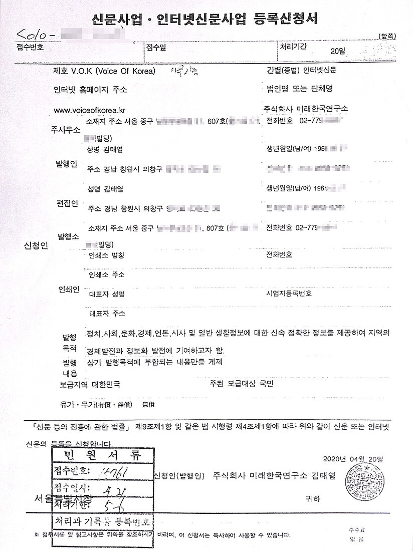 이 때문에 2020년 4월20일 서울 중구 ㅎ빌딩에 미래한국연구소 서울사무소를 설치했다. 또 같은 해 4월21일 서울시에 인터넷신문 ‘브이오케이’도 등록했다. 브이오케이 주사무소와 발행소는 미래한국연구소 서울사무소에 뒀다. 미래한국연구소 명의상 소장이었던 김태열씨가 서울사무소와 브이오케이 대표까지 맡았다. 하지만 브이오케이는 단 한번도 언론 활동을 하지 않았고, 일간신문 ‘브이오케이’ 역시 신문을 발행한 적이 없다.