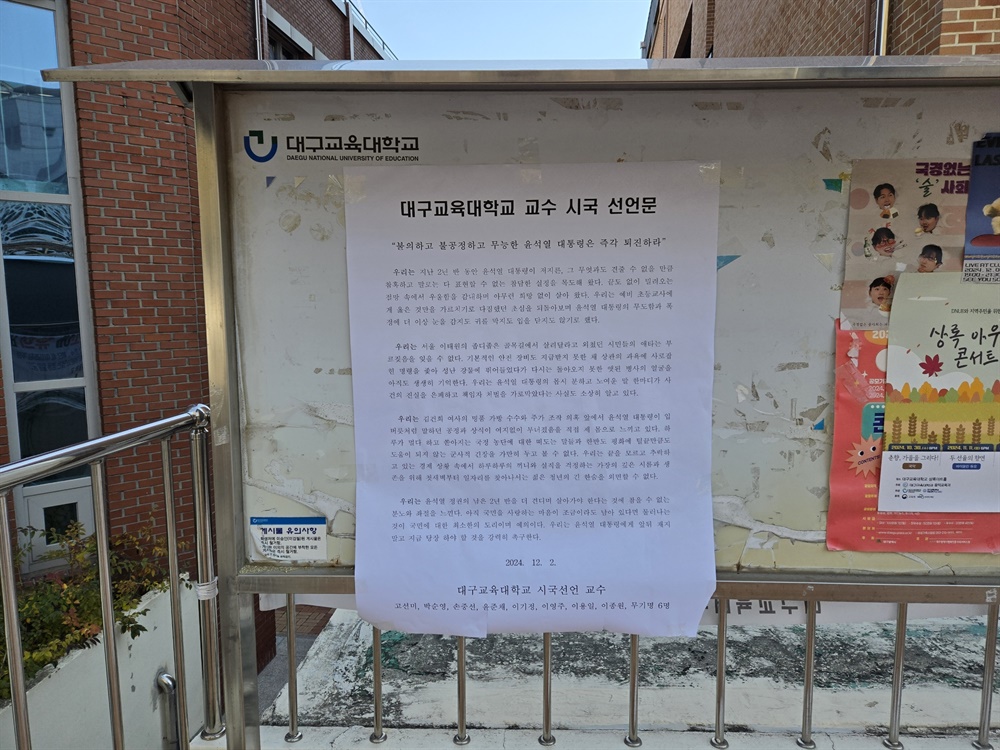 전국의 대학가와 지식인들의 윤석열 대통령 퇴진 요구 시국선언이 잇따르는 가운데 대구에서 교육대 최초의 시국선언이 나왔다.