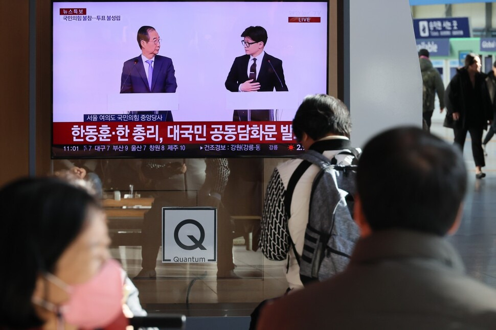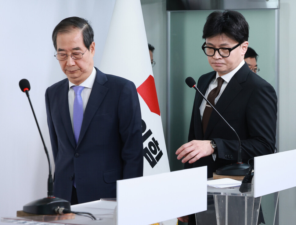 한 대표와 한 총리는 윤 대통령의 ‘조기퇴진’ 시기가 언제인지는 밝히지 않은 채, 외교를 포함한 모든 국정 현안을 집권여당과 당대표인 자신, 한 총리가 총괄하겠다는 뜻만 강조했다. 하지만 여당과 당대표가 이런 권한을 행사할 법적 근거는 없다. 한 총리는 지난 3일 윤 대통령의 비상계엄 선포에 동의해 ‘내란죄 공범’이란 지적을 받고 있다. 이날 담화는 전날 국민의힘이 윤 대통령 탄핵소추안을 폐기로 이끈 뒤 분노로 들끓는 여론을 수습하려 내놓은 방안이지만, 법적·정치적으로 적지 않은 파장이 예상된다.