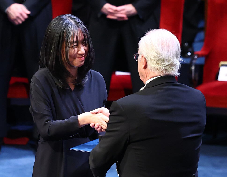 아시아에서 여성 최초로 노벨문학상을 받게 된 한강은 이날 처음 노벨상을 상징하는 블루카펫을 밟고 칼 구스타프 16세 스웨덴 국왕에게 메달과 증서를 받는다. 비딩 의장은 연설에서 “올해의 문학상은 역사적 트라우마를 배경으로 인간의 나약함을 깊이 탐구한 작품에 수여됐다”며 “(한강의 작품은) 변화를 향한 열망만큼이나 나락은 늘 가까이에 있음을 보여주고, 인간 존재의 비극적 조건을 조명한다”며 수상의 의의를 설명했다.