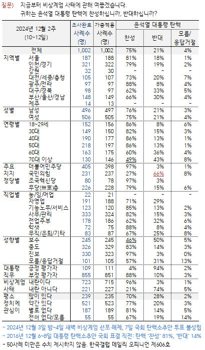 민심도 탄핵에 압도적이었습니다. 12월13일 발표한 한국갤럽 정례 여론조사에서 응답자의 75%가 탄핵 찬성, 21%가 반대였습니다. 모든 지역, 모든 연령층에서 탄핵 찬성 여론이 더 높았습니다. 대구·경북에서도, 70대 이상에서도 탄핵 찬성이 더 높았습니다. (중앙선거여론조사심의위 누리집 참고)