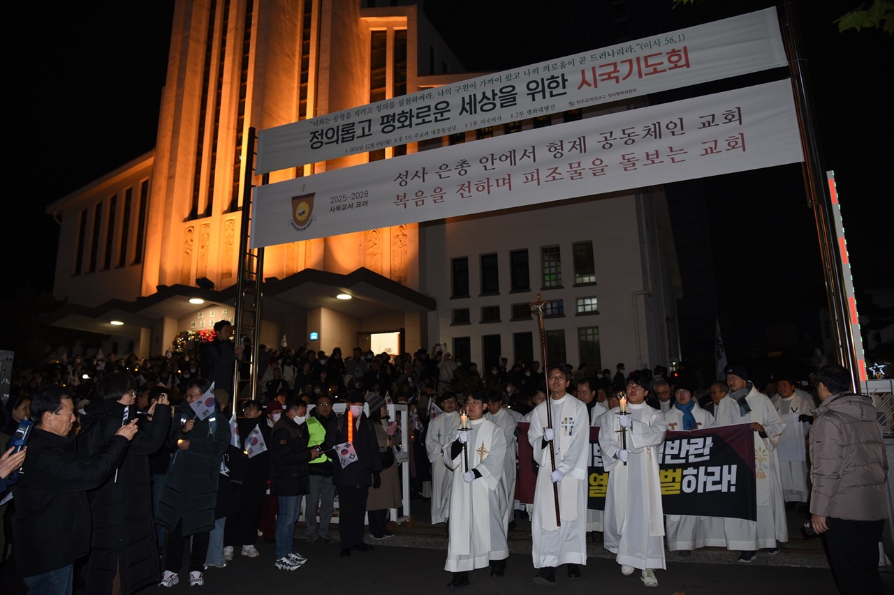 지난 3일 윤석열 대통령의 계엄령 선포에 이은 내란 사태가 종식되지 않은 가운데, 천주교대전교구 정의평화위원회가 9일 저녁 7시 주교좌 대흥동 성당에서 시국기도회를 개최했다. 대흥동 성당은 1층뿐 아니라 2층까지 만석을 이루었다. 급히 통로를 비롯한 빈 공간에 간이 의자까지 꺼 내 놓으며 대흥동 성당은 시국기도회 열기로 가득 찼다. 시국기도회에 참석한 사제들도 100여 명이 넘었다.