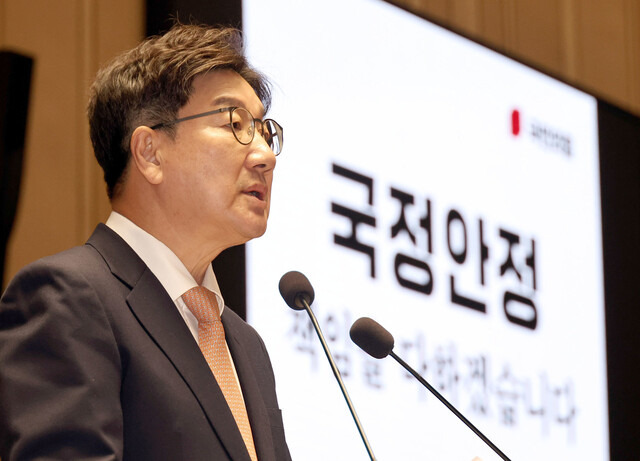 권성동 국민의힘 대표 권한대행 겸 원내대표는 이날 오전 국회에서 열린 의원총회 뒤 기자들과 만나 “우리는 (한덕수) 대통령 권한대행이 헌법재판관을 임명할 권한이 없다는 입장을 여전히 견지하고 있다”며 “헌법재판관 (임명동의) 표결도 참여하지 않기로 결정했다”고 말했다. 권 권한대행은 “(헌법재판관) 인사청문회에 (국민의힘이) 참석 안 했기 때문에 표결에 불참하는 게 좋다고 하자 의원들이 만장일치 동의했다”고 말했다. 다만 그는 “당론 결정 절차는 밟지 않았다”고 덧붙였다.