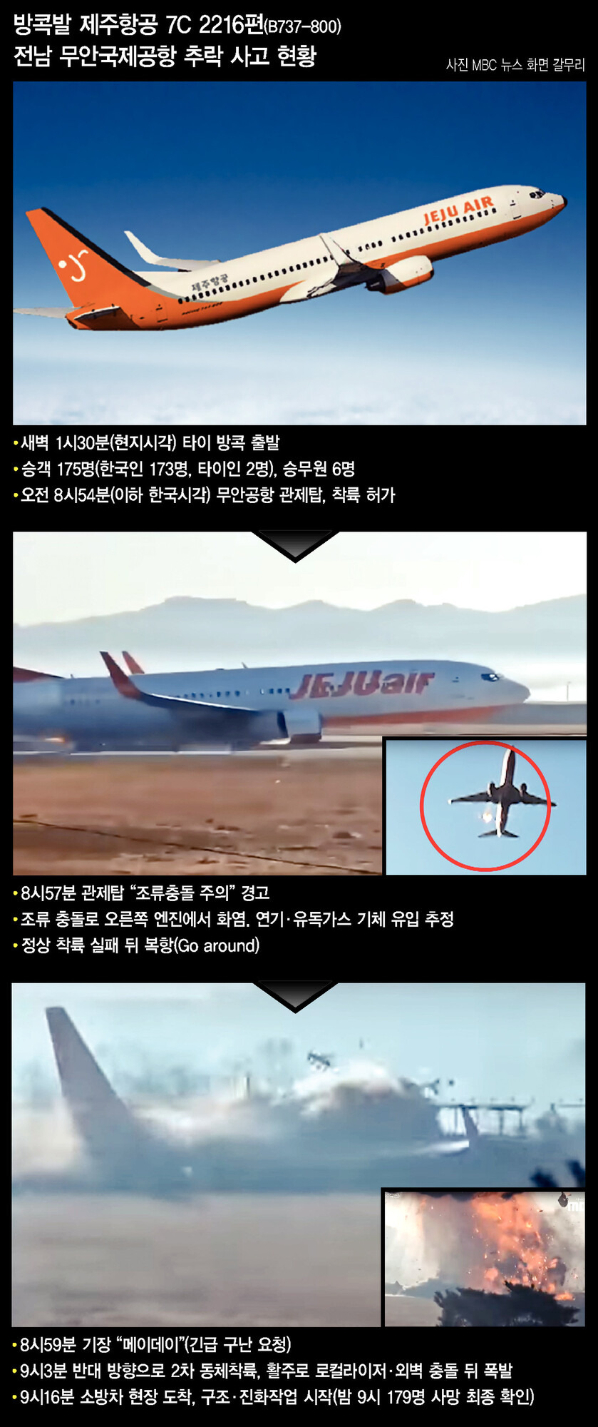 무안공항 관제탑이 착륙 허가를 내린 건 아침 8시54분이다. 이후 3분 만인 8시57분 관제탑은 조류 충돌(버드 스트라이크)을 경고했으나 불과 2분 뒤인 59분에 사고기 기장은 긴급 조난신호인 ‘메이데이’(Mayday)를 보냈다. 사고기는 정상 착륙 방향인 01번 방향(남쪽에서 북쪽)으로 착륙하려 했으나 실패하고 기수를 돌려 반대 방향인 19번 활주로로 동체착륙을 시도했다. 항공당국에 접수된 사고 초동보고 시각은 오전 9시3분께다. 착륙 허가부터 사고 보고까지 10분도 채 안 된 사이에 대형 참사가 발생한 셈이다. 착륙 때 폐회로텔레비전에 찍힌 영상을 보면 기체 오른쪽 엔진에서 연기가 나고 있었다.