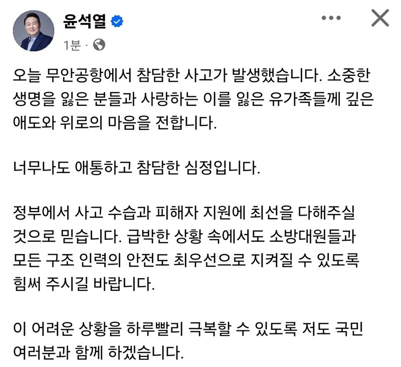 윤 대통령은 이날 페이스북에 글을 올려 “오늘 무안공항에서 참담한 사고가 발생했다”며 “소중한 생명을 잃은 분들과 사랑하는 이를 잃은 유가족들께 깊은 애도와 위로의 마음을 전한다”고 했다. 이어 “너무나도 애통하고 참담한 심정”이라며 “정부에서 사고 수습과 피해자 지원에 최선을 다해주실 것으로 믿는다”고 당부했다. 이어 “급박한 상황 속에서도 소방대원들과 모든 구조 인력의 안전도 최우선으로 지켜질 수 있도록 힘써 주시길 바란다”고 했다.