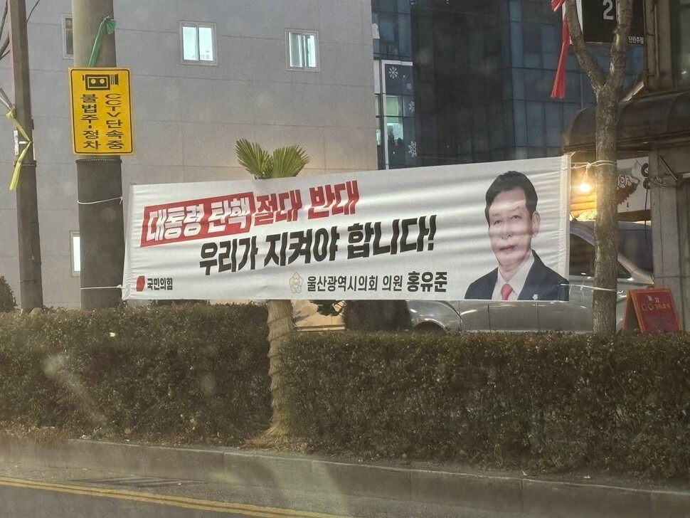홍 시의원은 지난 25일 오후 자신의 지역구인 울산 동구 일산동과 전하동 일대 10곳에 ‘대통령 탄핵 절대 반대 우리가 지켜야 합니다’라고 쓴 펼침막을 걸었다.