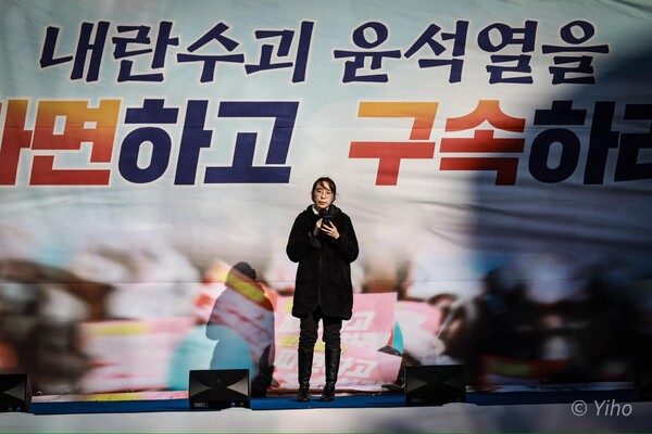 김지선 서울촛불행동 공동대표는 집회에 문을 열면서 "고위공직자범죄수사처가 정당한 법 집행도 제대로 하지 못한다는 건 말이 되지 않는다"며 "윤석열이 경호처를 자기 사병처럼 쓰고 있다. 이 나라 공권력은 국민 진압에는 폭력을 저지르면서 국민 학살을 하려고 한 대통령에게는 무력하다"고 비판했다.