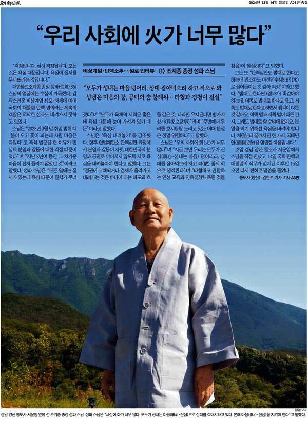 1면 톱기사부터 달랐다. 지난달 14일 윤석열 대통령 탄핵소추안 국회 통과 뒤 나온 지난달 16일자 지면. 동아일보·중앙일보는 윤석열 대통령의 검찰 출석 거부를 1면 톱으로 정했다. 윤 대통령에 대한 조속한 수사가 요구되는 상황에서 윤 대통령이 검찰 출석을 거부하고 있는 것을 주요한 화두로 본 것이다. 하지만 조선일보는 이날 1면 톱기사로 조계종 종정 성파 스님 인터뷰를 다뤘다. 기사 제목은 <“우리 사회에 火가 너무 많다”>다.