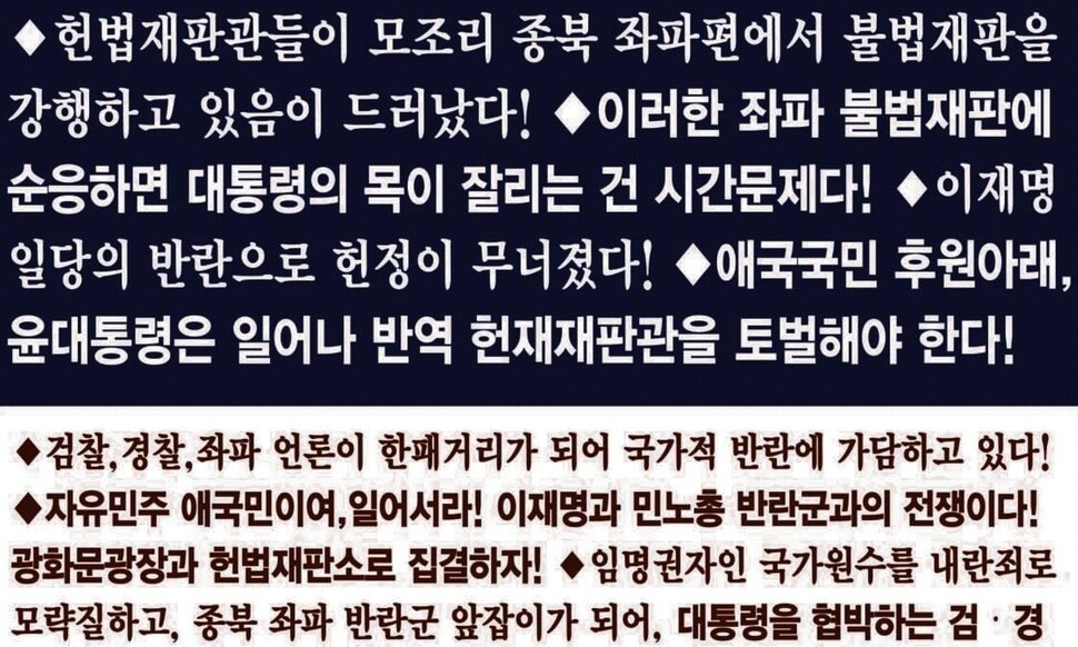 이어지는 문구는 더 극단적이다. “헌법재판관들이 모조리 종북 좌파 편에서 불법재판을 강행하고 있음이 드러났다”, “애국국민 후원 아래, 윤 대통령은 일어나 반역 헌재재판관을 토벌해야 한다” 등 헌법재판소를 겨냥한 폭력적인 구호가 담겼다. “이재명 일당의 반란으로 헌정이 무너졌다“, “검찰·경찰·좌파 언론이 한패거리가 되어 국가적 반란에 가담하고 있다” 등 야당과 수사기관, 언론을 한데 묶어 “종북 좌파 반란군”이라고 지칭하는 표현도 있다.