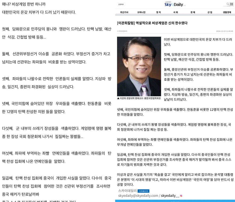 그런데 7일 <오마이뉴스> 확인 결과, 이 같은 내용은 이관희 전 경찰대 명예교수가 지난 12월 23일 보수 성향 인터넷 매체인 <스카이데일리>에 기고한 '역설적으로 비상계엄은 신의 한수였다'는 제목의 칼럼 내용과 거의 일치했다.
