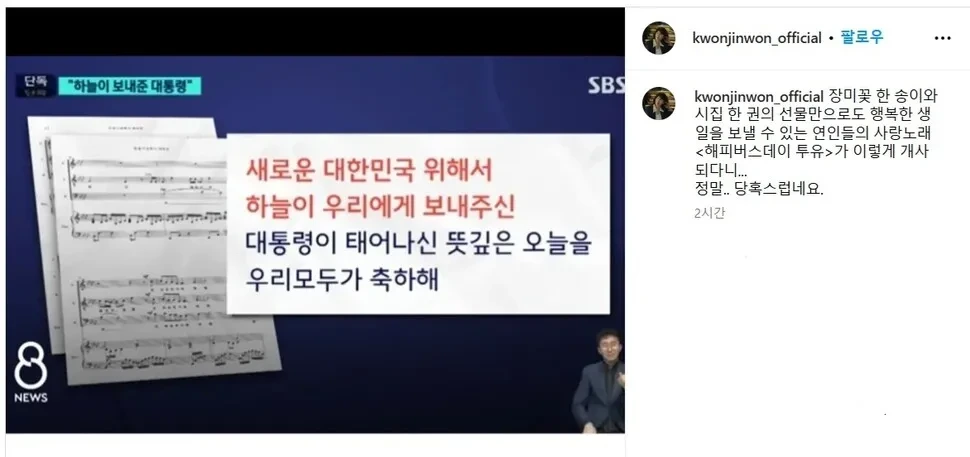 가수 권진원씨는 17일 인스타그램에 에스비에스(SBS) 보도 화면을 갈무리한 사진과 함께 글을 올려 “장미꽃 한송이와 시집 한권의 선물만으로도 행복한 생일을 보낼 수 있는 연인들의 사랑 노래 ‘해피 버스데이 투 유’가 이렇게 개사 되다니 정말 당혹스럽다”고 밝혔다.