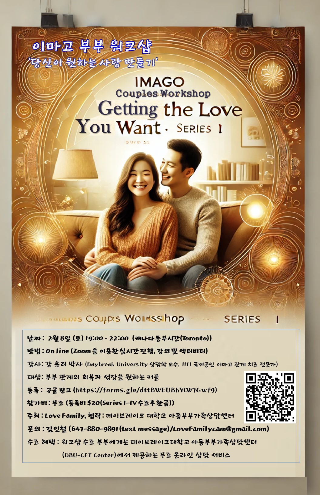 ‘Love Family’(대표 김인철)가 주최하고 미국 데이브레이크 대학교(Daybreak University:DBU) 아동 부부 가족상담센터와 협력으로 무료 진행하는 ‘이마고 커플스 워크솝(Imago Couples Workshop)’ 의 Series I 이 오는 2월8일(토) 저녁 9시부터 10시까지 온라인(Zoom)으로 열린다.