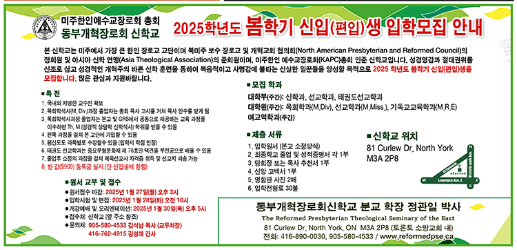 원수접수는 오는 1월27일 오후 3시까지 노스욕 81 Curlew Drive.North York, M3A 2P8) 소재 소망교회에 있는 신학교 사무실에서 받는다. 입학원서는 학교 웹사이트 www.reformedpse.ca에서 다운받고 졸업·성적증명서와 신앙고백서, 추천서 등 관련 서류들과 $30의 전형료를 납부하면 된다. 입학시험과 면접은 1월28일(화) 오전 10시에 실시하며 개강예배와 오리엔테이션은 1월30일(목) 오후 5시로 예정하고 있다.