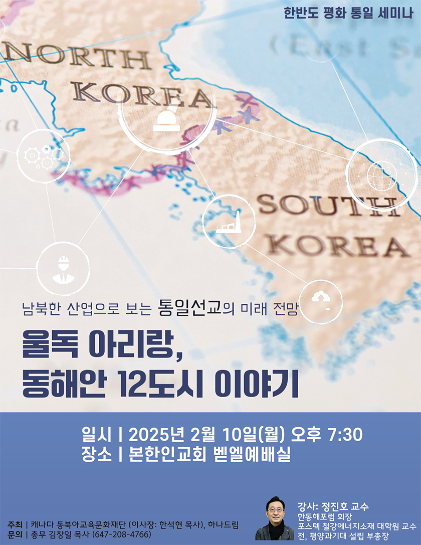 정진호 교수는 캐나다 동북아 교육문화협력재단(이사장 한석현 본 한인교회 원로목사)과 하나드림이 오는 2월10일(월) 오후 7시30분 본 한인교회 벧엘예배실에서 개최하는 한반도 평화통일 세미나에서 ‘남북한 산업으로 보는 통일선교의 미래전망- 울독 아리랑, 동해안 12도시 이야기’라는 주제로 강연할 예정이다.