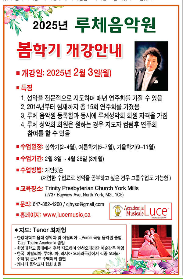 테너 최재형 교수가 성악을 전문지도하며 해마다 연주회로 발표 기회를 제공하는 ‘루체음악원’이 2월3일(월) 개강을 앞두고 2025년 봄 학기 수강생을 모집한다.