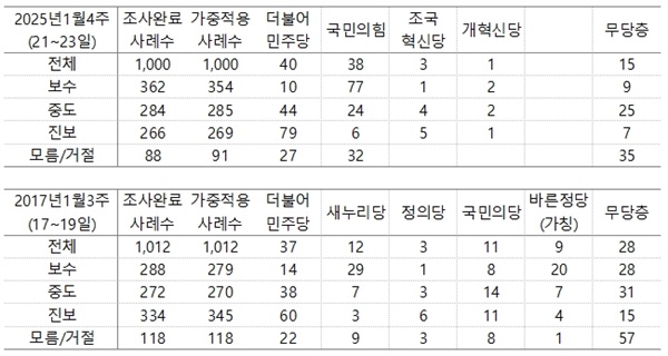 ▲정당 지지도 비교(2017년과 2025년 1월)두 번의 탄핵 정국에서 나타난 정당 지지도를 한국갤럽 조사결과에서 가져와 비교해봤다.한국갤럽