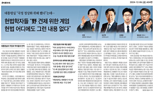 특히 국회에 군을 투입한 데다 포고령 1호로 국회 활동을 전면 금지한 대목의 위헌성은 명백하다. 조선일보조차 지난해 12월 6일 <헌법학자들 "野 견제 위한 계엄 헌법 어디에도 그런 내용 없다">고 보도했다. 심지어 이 기사에선 이후 윤 대통령의 탄핵심판 법률대리인으로 선임된 배보윤 변호사가 "국가 비상사태에 해당하는지는 논란이 있을 수 있고 감사원장을 비롯해 고위 공직자들이 줄줄이 탄핵대상이 되는 상황은 국가 기능의 마비 상태인 것은 명백하다"면서도 "계엄은 속성상 국회에 대해서는 할 수 있는 부분이 없기 때문에 적절한 조치로 볼 수 없다"고 평가한다.