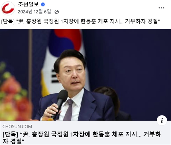 ▲조선일보 페이스북이 12월 6일 '홍장원 전 국정원 1차장이 윤 대통령 체포 지시를 받았다'는 내용의 자사 단독보도를 홍보하는 게시물. ⓒ 조선일보 페이스북 갈무리관련사진보기