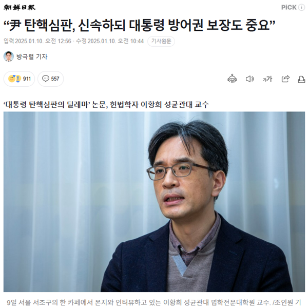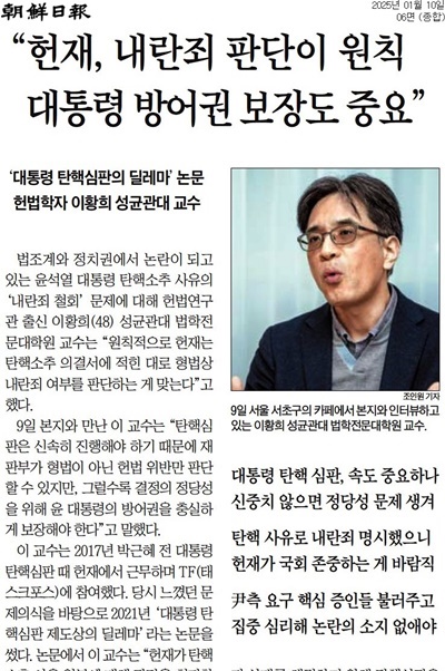 대통령 탄핵심판에서 헌재는 ‘신속성’과 ‘신중성’을 둘다 충족해야 하는데, 이 교수는 둘 중에 ‘신속성’을 우선해야 한다는 입장이다. 물론 신속성을 훼손하지 않는 범위에서 신중하게 판단하고 대통령 방어권도 보장해야 한다고 했다. 또한 헌재가 대통령의 형사법 위반 여부를 판단해야 할지에 대해 ‘원칙’은 청구인(국회)가 제시한 대로 형사법을 판단해야 하지만 ‘예외’적으로 판단하지 않을 수 있다. 이 교수는 예외를 허용해 다른 사유로 파면이 가능하면 신속성 요청을 위해 형사법 위반 여부를 헌재가 판단하지 않을 수 있고, 이번 내란죄 쟁점이 여기에 해당한다는 입장이다. 그런데 조선일보는 10일자 6면에 <“헌재, 내란죄 판단이 원칙 대통령 방어권 보장도 중요”>라면서 두 쟁점을 모두 이 교수 입장과 다르게 제목을 달았다.