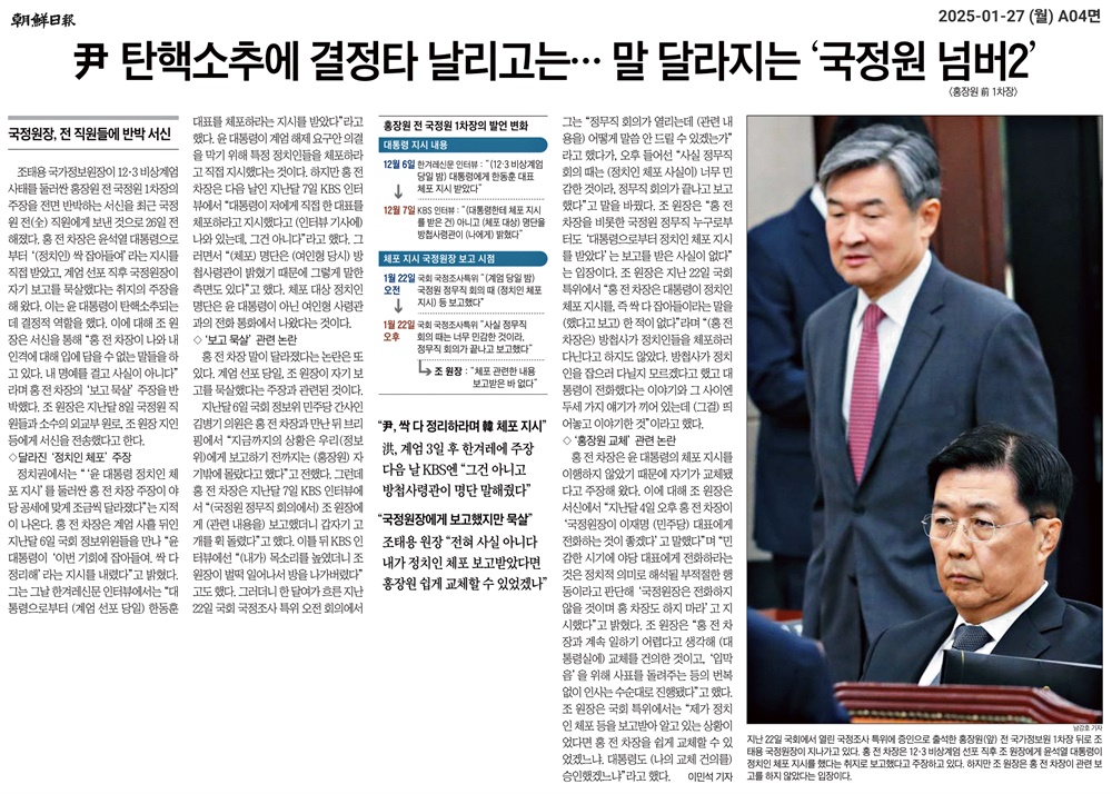 27일자 이 신문은 <尹 탄핵소추에 결정타 날리고는… 말 달라지는 '국정원 넘버2'> 기사에서 홍 전 차장이 야당의 공세에 맞춰 '윤 대통령의 체포지시'에 관한 발언을 조금씩 바꿨다고 보도했다. 그가 지난해 12월 6일 한겨레 인터뷰에선 "대통령에게 한동훈 대표 체포 지시를 받았다"고 했다가 12월 7일 KBS 인터뷰에선 "대통령이 저에게 직접 한동훈 대표를 체포하라고 지시한 것은 아니고, (체포) 명단은 (여인형) 방첩사령관이 밝혔기 때문에 그렇게 말한 측면도 있다"고 말했다는 이유다.