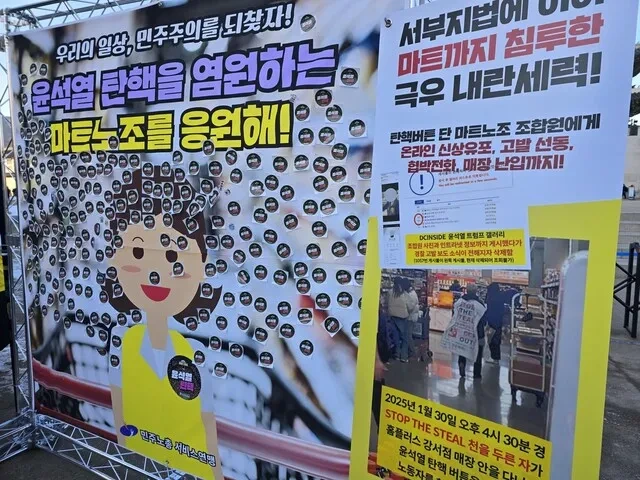 마트 노동자 김미정 씨는 "마트 노동자들은 윤석열 탄핵 배지를 옷에 달았다는 이유로 극우의 표적이 됐다"며 "극우 세력들은 (온라인에) 좌표를 찍어 배지를 달고 있는 노동자를 매장에 찾아가 욕설을 했다"고 고발했다. 이어 "개인 신상을 온라인에 올리기도 한다. 이들은 법치국가를 무시하고 자신과 반대하는 사람을 빨갱이로 만들어 내전을 일으키려고 하는 것"이라고 분노했다.