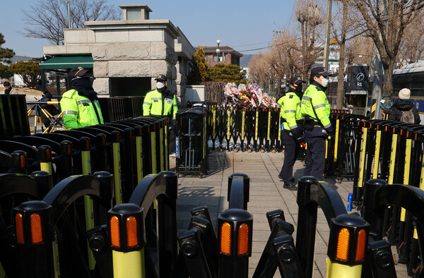 내란 수괴 피의자 윤석열 대통령의 탄핵심판 7차 변론이 11일 서울시 종로구 헌법재판소에서 열렸다. 이날 경찰은 헌법재판소에 기동대 46개 부대 2700여 명과 경찰버스 140대를 투입해 차로와 인도 통행을 제한했다. 최근 윤 대통령 지지자들이 온라인에서 헌재 난동을 모의한 정황이 포착됐기 때문이다.