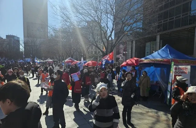 이로부터 5년이 흐른 2025년, 광화문에선 주말마다 전 목사가 주도하는 집회가 여전히 열린다. 설 연휴 첫날인 1월25일 오후 2시, 광화문 동화면세점 앞에 설치된 무대에 전 목사의 측근으로 알려진 사랑제일교회 조우행 목사가 올랐다. 이미 집회가 시작한 지 약 2시간이 지나 잔뜩 달아오른 분위기에서 그는 헌금 시간이 됐음을 알렸다. “명절날 대통령께서 이 자리 오셔서 여러분에게 선물 주셨죠. 지지율 50%로. 이거 다 하나님이 주신 겁니다. 그러니까 우리도 하나님께 명절 선물을 드려야 할 것 아니요. 대통령이 빨리 석방되시고 자리로 복귀하셔서 나라를 잘 다스려주세요 하는 소원예물도 되는 것이고….”