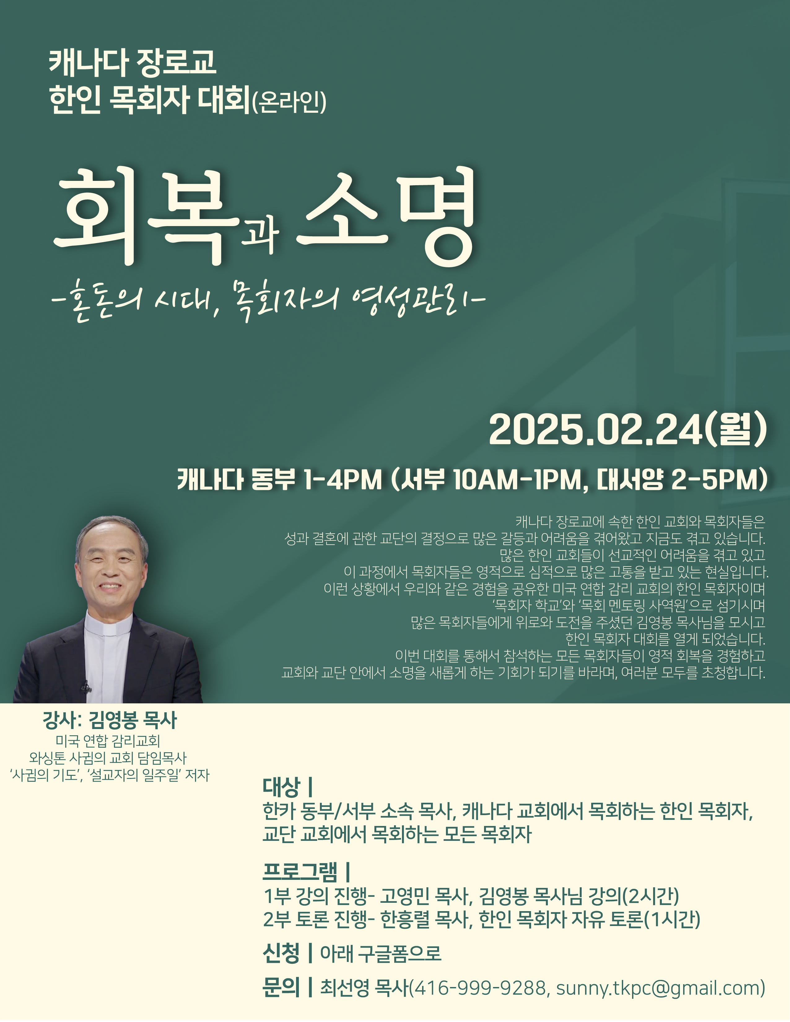 ‘회복과 소명- 혼돈의 시대, 목회자의 영성관리’라는 주제로 여는 이번 한인목회자 대회는 미국 와싱톤 사귐의교회 김영봉 담임목사를 강사로 진행한다. 참가대상은 캐나다 장로교 한카동부노회와 서부노회 소속 목사를 비롯해 캐나다 교회에서 목회하는 한인목회자와 교단교회에서 목회하는 모든 목회자가 참여할 수 있다.