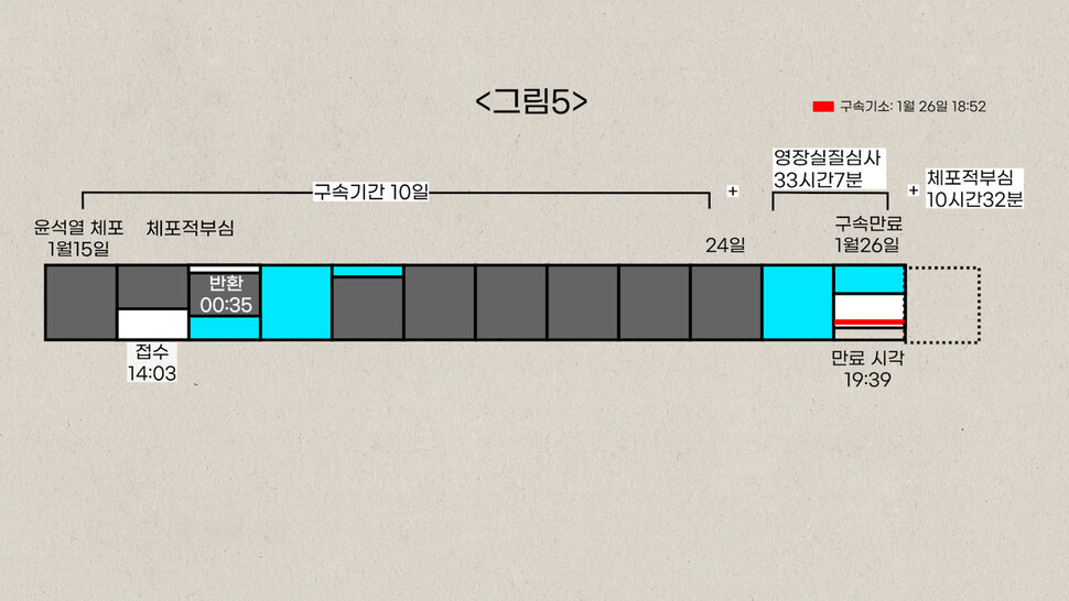 하얀색 부분이 있습니다. 이것은 ‘체포적부심’이 이뤄진 기간입니다. 체포적부심은 거의 이용되지 않는 제도인데 윤 대통령은 이걸 꺼내들었죠. 어쨌든 이 절차에 10시간가량이 소요됐습니다. 이 기간도 구속기간에서 빼야 합니다. 하얀색 부분만큼 구속기간이 늘어나는 겁니다. 이렇게 되면 윤 대통령 기소 시점은 그 하얀색 안에 들어갑니다. 구속만료 전에 기소가 이뤄진 것입니다.