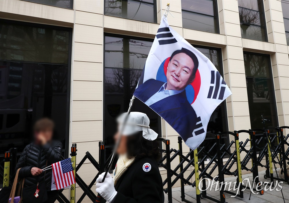 ▲지난 12일 오후 서울 종로구 헌법재판소앞에서 윤석열 대통령 탄핵 각하 시위를 벌이는 한 지지자가 윤석열 대통령 얼굴을 새긴 태극기를 들고 있다.권우성