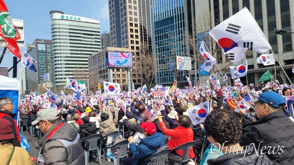 이날 탄핵 반대 집회 참가자는 광화문광장 일부와 동화면세점부터 시청 앞까지 이르는 8차선 도로에 가득 들어찼다. 이들은 대부분 70대 이상 노년층으로 보였다. 전국 각지에서 올라온 전세버스는 시청역 주변 곳곳에 섰다 떠났다를 반복했다.