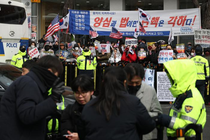 헌법재판소의 윤석열 대통령 탄핵 심판 선고가 임박한 가운데 18일 서울 종로구 헌법재판소 앞에서 윤 대통령 지지자들이 탄핵 각하를 외치고 있다. 권도현 기자