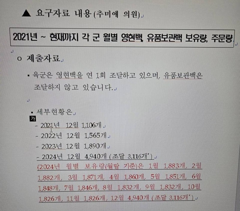 추 의원은 이날 자신의 페이스북에 지난 2021년 12월부터 2024년 12월까지 군 월별 영현백, 유품보관백 보유량과 주문량 자료를 공개하면서 "내란 세력은 악을 몽상만 하고 있었던 것이 아니다"라고 지적했다.