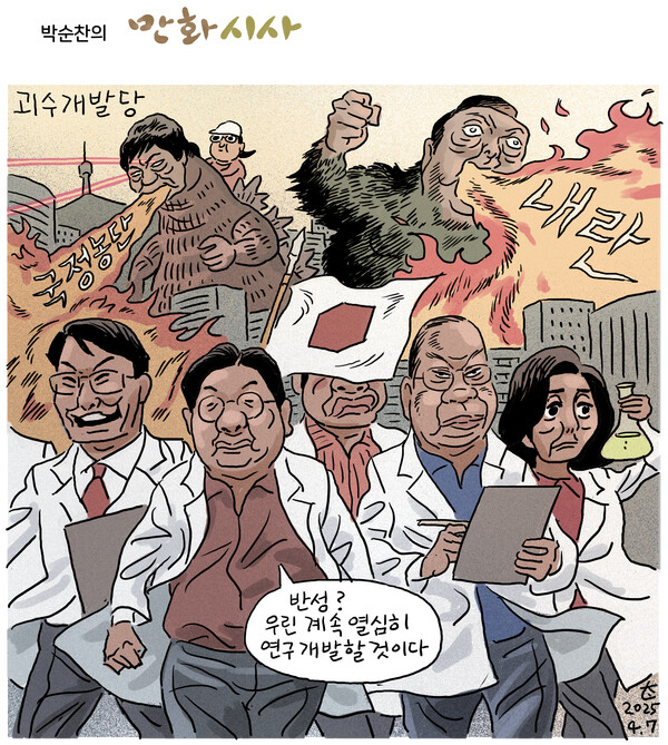 불과 2주도 안된 이야기다. 그런데 그게 아니었다. ‘괴물’의 퇴장이 끝이 아닌, 역시 친위 쿠데타의 뒤끝은 만만치가 않다. 탄핵에서 풀려난 총리가 곧바로 국민들 뒤통수를 치며 도전을 감행했다. 대통령 대행이랍시고 내란공범 용의자를 헌재 재판관에 지명하는 월권적 조치로 ‘배째라 노추’를 과시했다. 내란을 적극 비호해 ‘내란당’ 소리를 듣는 정당은 그에게 대선후보로 오라고 읍소하고 있다. 자기네 1호 당원이 파면됐는데도, 승복이나 사죄, 대선 양보는 고사하고 파면된 자에게 줄을 서서 친분을 자랑하고 그의 허풍을 흉내내기에 바쁜 낯두꺼운 후보군.