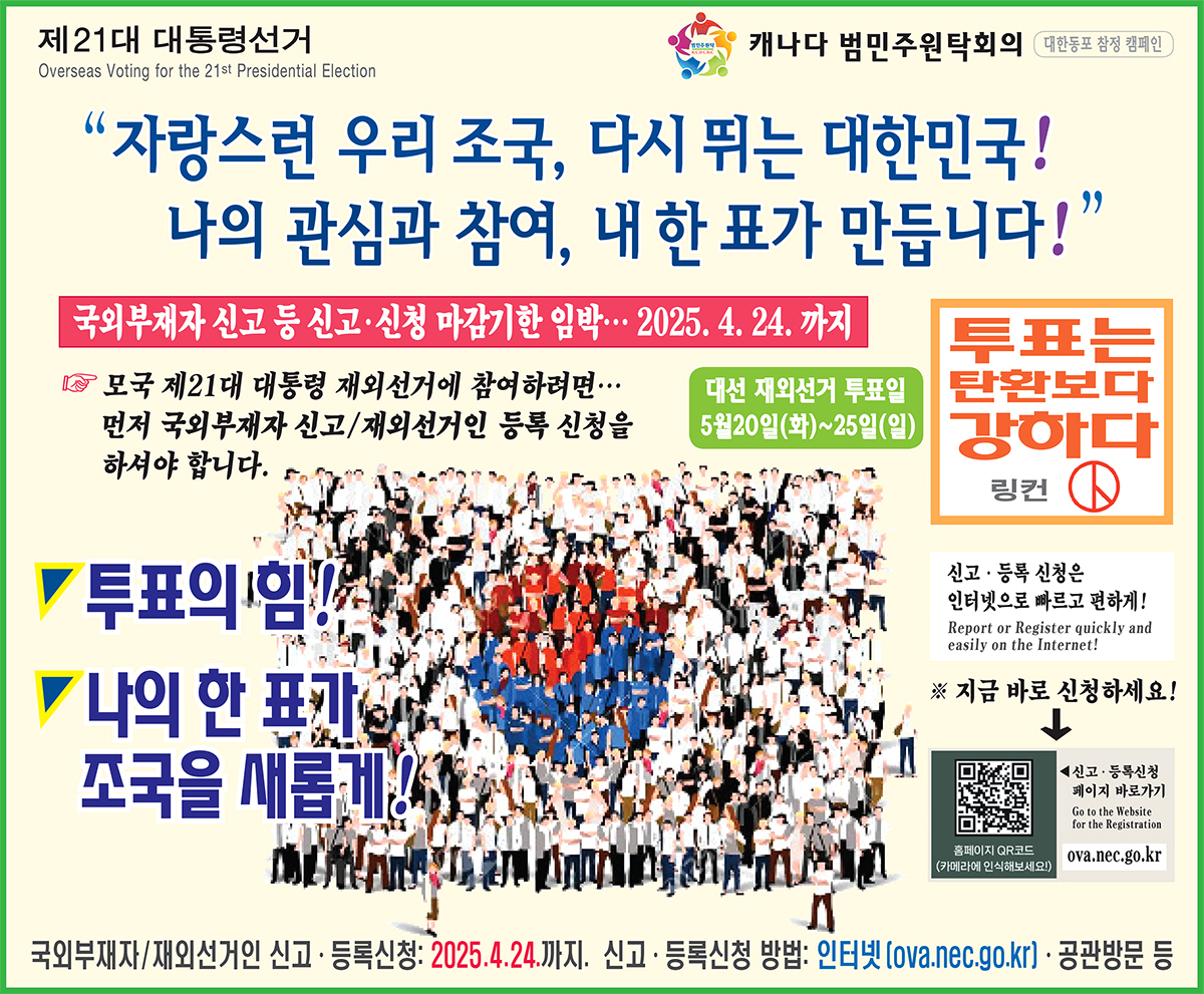 캐나다 범민주원탁회의(KCDCRC: Korean Canadian Democratic Community Roundtable Conference)가 모국의 대통령 파면으로 조기 실시되는 6.3 제21대 대통령선거를 맞아 한인 재외동포들의 선거참여 운동인 ‘대한동포 참정 캠페인’을 전개한다며 동포사회의 적극 호응을 요망했다.